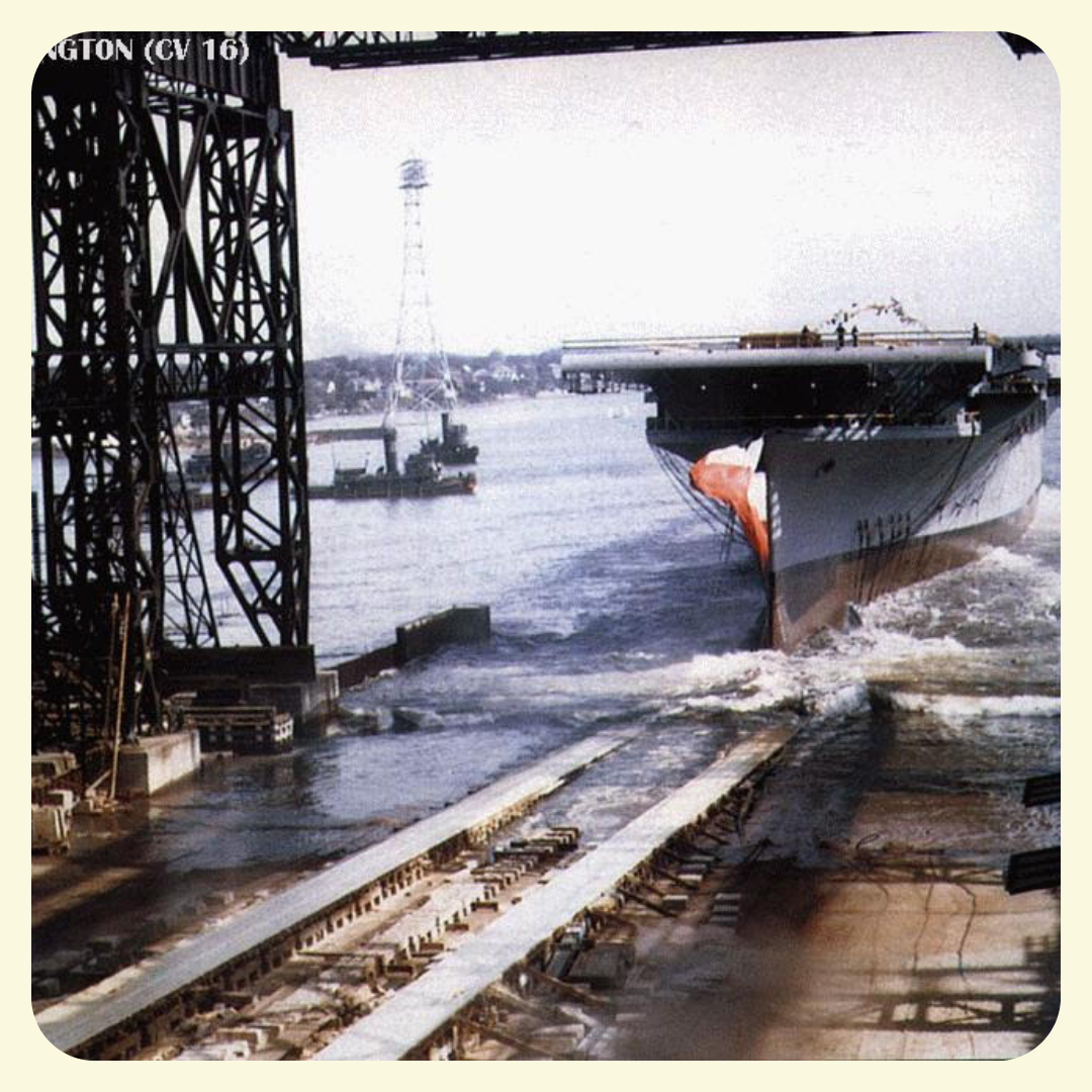 Nata come portaerei classe Essex e iniziata la sua costruzione come U.S.S. Cabot nel Luglio 1941, presso i cantieri navali di Fore River a Quincy, Massachusetts, un avvenimento ne influenzò il cambio di nome. Nel maggio del 1942, la U.S.S. Lexington CV-2 costruita venti anni prima dagli stessi cantieri venne affondata nel Mar dei Coralli durante un aspro scontro con la marina imperiale giapponese. Fu così che i lavoratori del cantiere richiesero al segretario della marina di cambiare il nome da Cabot a Lexington. La U.S.S. Lexington CV-16 divenne cosi la quinta nave della U.S. Navy a portare il nome della battaglia della Rivoluzione Americana di Lexington. Proprio dal retaggio rivoluzionario prende ispirazione la sua insegna rappresentata sul petto della nostra t-shirt.