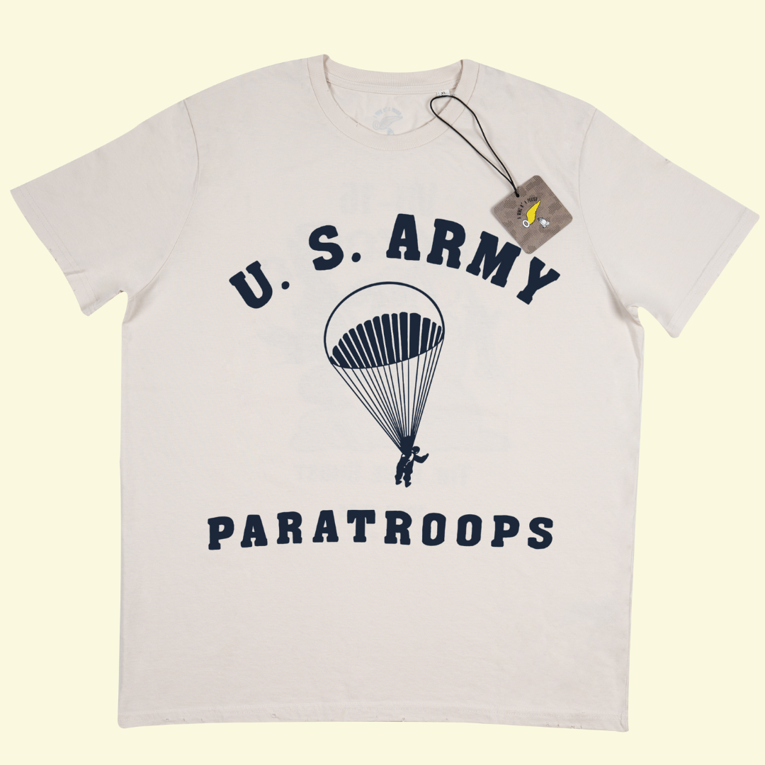 T-Shirt ispirata ai capi indossati durante il periodo di addestramento o la permanenza in caserma dai membri delle divisioni di paracadutisti dell’Esercito Americano. Come le altre t-shirt